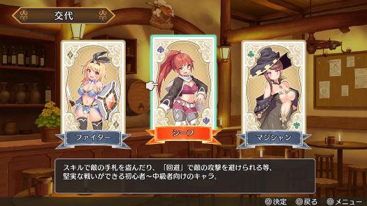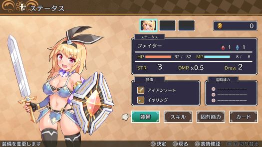 ファイター以外の二人がトランプ用のイカサマスキルが多いのに対して、ファイターはRPG的なスキル内容で、例えば「カードを1枚ドローして攻撃力と受けるダメージが2倍になる」とか「防御した次のターンは攻撃力1.3倍」とか、使いどころに困る物が揃っているので、初期キャラが一番のクセつよってどうなん?って思っちゃいました。(´∀`)
