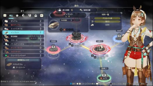 調合能力の強化はツリー状になっていて、ポイントを消費して1つずつ能力やレシピを取っていく形なのですが、枝分かれした先にどんな能力があるのか予想しにくく、余計なルートに入ると、何も変化がないのにスキルポイント稼ぎで停滞する時間が発生するという罠っぽさがあります。