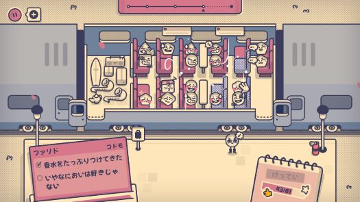 「一人でいたい」だとか「一番前がいい」といった簡単な要望だけでなく、体臭や香水の匂いがする人の傍は嫌だとか、冷房の風が当たるのは嫌などの一定のエリアに影響がある物をさけないといけない要望もあるので、最初は割と自由なんですが、難易度の上がる後半になるとかなり正解が固定されてくる内容になっています。
