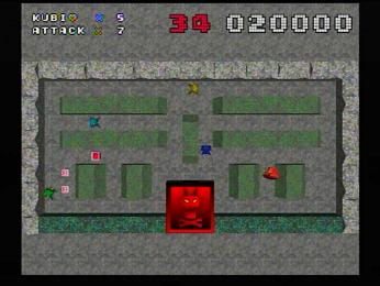 敵のAIはこっちを追ってくるんじゃなく完全ランダムで動き、こちらの攻撃方法は近距離型でゲームオーバーまで共通の回数制。 つまり一気に敵を倒す快感も駆け引きもないし、攻撃回数をラストステージまで使いきらないように節約しながら使う必要があるってこと。 袋小路で敵に追い詰められた時などのために残しておかないと。