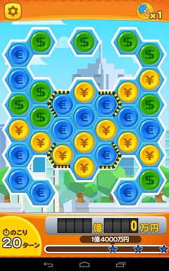 この辺りまでくると、コマを4つ以上繋げて札束に変えて思った方向に飛ばして消す、というテクも必要になってくるのですが、その札束飛ばしと通常の繋げる動作を塞ぐ壁が現れたりしてます。