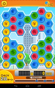 3つ以上の同種のお金マークを繋いで消して、全部のマスの色をひっくり返すゲームですね。