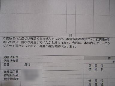 「ご依頼された症状は確認できませんでしたが、本体背面の冷却ファンに異物が付着しており、症状が発生していたかと思われます。 今回は、本体内をクリーニングさせて頂きましたので、再度ご確認をお願い致します。」