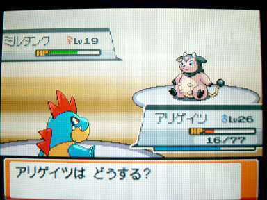 「ミルクを飲む」で減ったHPをがばっと回復し、メロメロにする攻撃でこっちのポケモンがチャーム状態になって一切行動が行えなくなり、ミルクを飲まないから攻撃チャンスかと思いきや、リーダーがいい傷薬でがっつりHPを回復させるというなんとも長期戦仕様な戦闘スタイル。 攻撃も地味に強い。