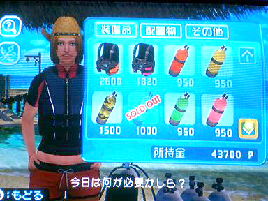 で、お金を貯めて装備品を買ったり、人口湾でアクアリウム的にサンゴを配置して魚を呼んだりする備品を買ったりするんですけどね。