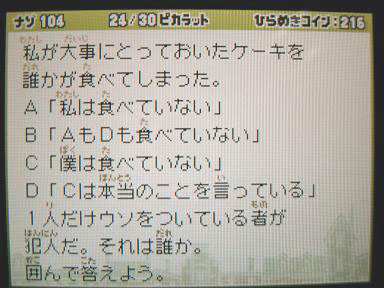 誰か一人がウソを言っているという前提で考えていくと誰がウソを言っていてもおかしいことに気付くのですが、画面上に選択肢がありません。じゃあ答えられない。自分の頭が悪いので何か見落としが?となるのですが、そういう風にハメるためにワザと書かなかったとしか思えません。意地わっるぅ。