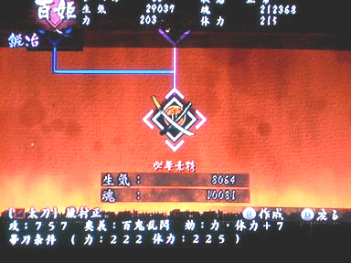そして、それも両方でクリアするとまた刀が手に入り、さらにマップ上の「魔窟」と呼ばれる雑魚が盛りだくさんでてくるステージに挑んで隠された刀も全て手に入れると、ゲームタイトルにもなっている刀、「朧村正」が作れるようになります。