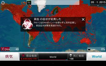 すごいシンプルなゲームで、基本的には世界地図を見ながら、進化に必要なポイントがゲットできるバルーンアイコンや薬の開発を邪魔するバルーンアイコンをタッチして潰すもぐら叩きゲームなのですが、じわじわ世界に自分の病原菌が広がっていくのが妙に楽しい。