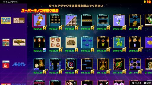 ファミコンゲームの一部分を切り出し、「コインを20枚取る」とか「敵を4体倒す」といった内容でタイムアタックを行うゲームになっとります。