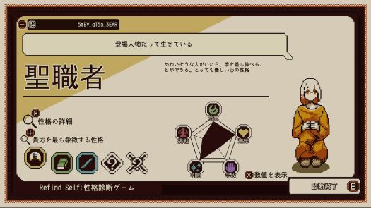 てな感じでエンディングまでプレイしたところ、これって確かに性格診断だとは思うものの、特に「ゲーム中の性格」というか「プレイスタイル」の診断なのだろうなぁと感じました。