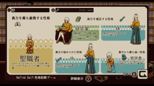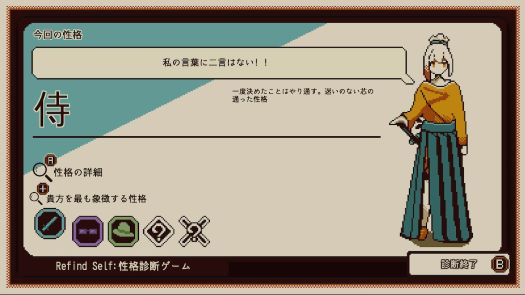 で、最終的に補足する性格としては「研究家」と「侍」と判定され、秘められた性格も「侍」で、最も遠い性格は「哲学者」となりました。